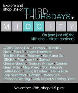 Every third Thursday, Mid City (on and just off 14th street and the U street corridor) shops in D.C. stay open late and have incredible sales. Mid City has really taken this event to a fantastic level with a night of great fun & sales for you!